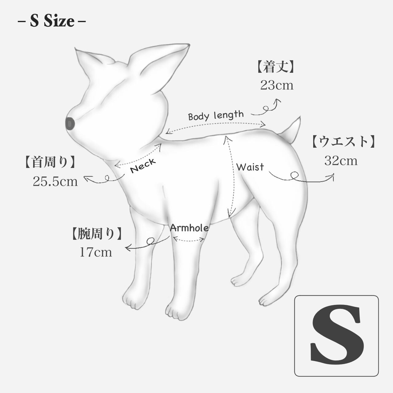 S → 首周り:25.5cm、着丈:23cm、腕周り:17cm、ウエスト:32cm